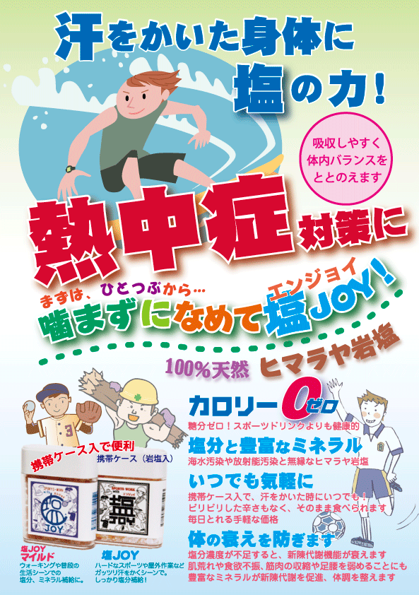 日本では昔から、夏には梅干しを食べたり、スイカに塩をかけて食べる事により夏バテ防止をしてきましたが、最近は食卓から味噌汁や漬物が姿を消し、減塩を基本とした料理が主流となっています。冬場や汗をかかない方には減塩は必要な(大切な)事ですが、家族全員が同じ減塩食では夏場にスポーツや仕事で大量に汗をかく方や炎天下で遊ぶお子様達は塩分不足となり熱中症にかかりやすくなってしまいます。また、普段は汗を多くかかない方でも、スポーツシーンではやはり塩分不足が考えられます。
