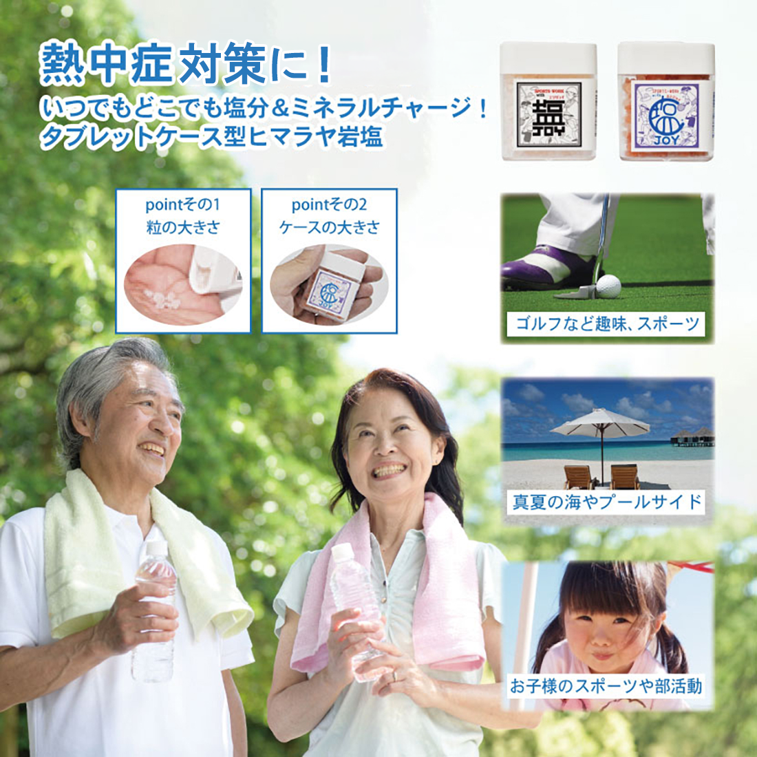 汗をかくシーンでは、持ち運びに便利な携帯ケース入り塩JOYをカバンやお車に常備いただき、そのままで、または水に溶かしてミネラルたっぷりのミネラルウォーターとしてお試しください。塩分&水分・ミネラルを一石三鳥で摂取することが出来ます。